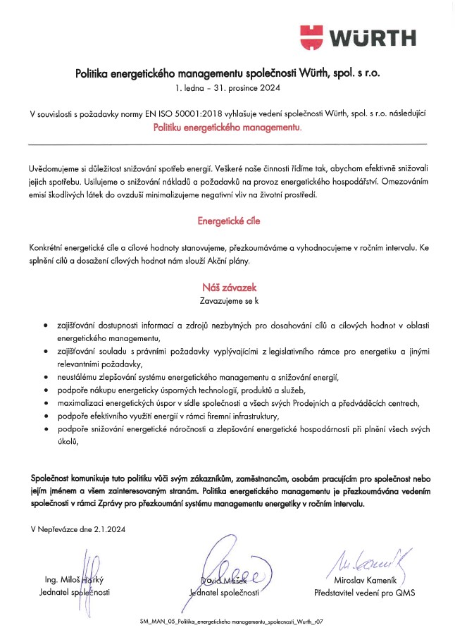 V souvislosti s požadavkem normy ČSN EN ISO 50001 vyhlásila společnost Würth, spol. s r.o. politiku energetického managementu.