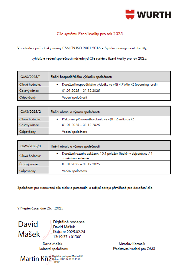 V souvislosti s požadavkem normy ČSN EN ISO 9001 vyhlásila společnost Würth, spol. s r.o. politiku kvality.